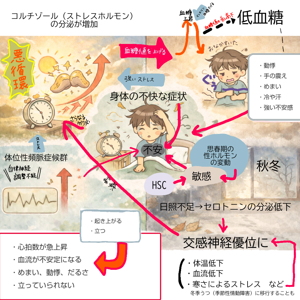 HSC(Highly Sensitive Child)のように、刺激や体の変化を感じ取りやすい気質がある場合、・心拍の変化・めまい・違和感や不快感といった身体感覚を、より強く、より早く察知することがあります。これは弱さではなく、感じ取る感度が高い特性です。しかし、POTSや自律神経の不安定さがあると、その感受性の高さによって不快感や不安が増幅されて感じられることがあります。